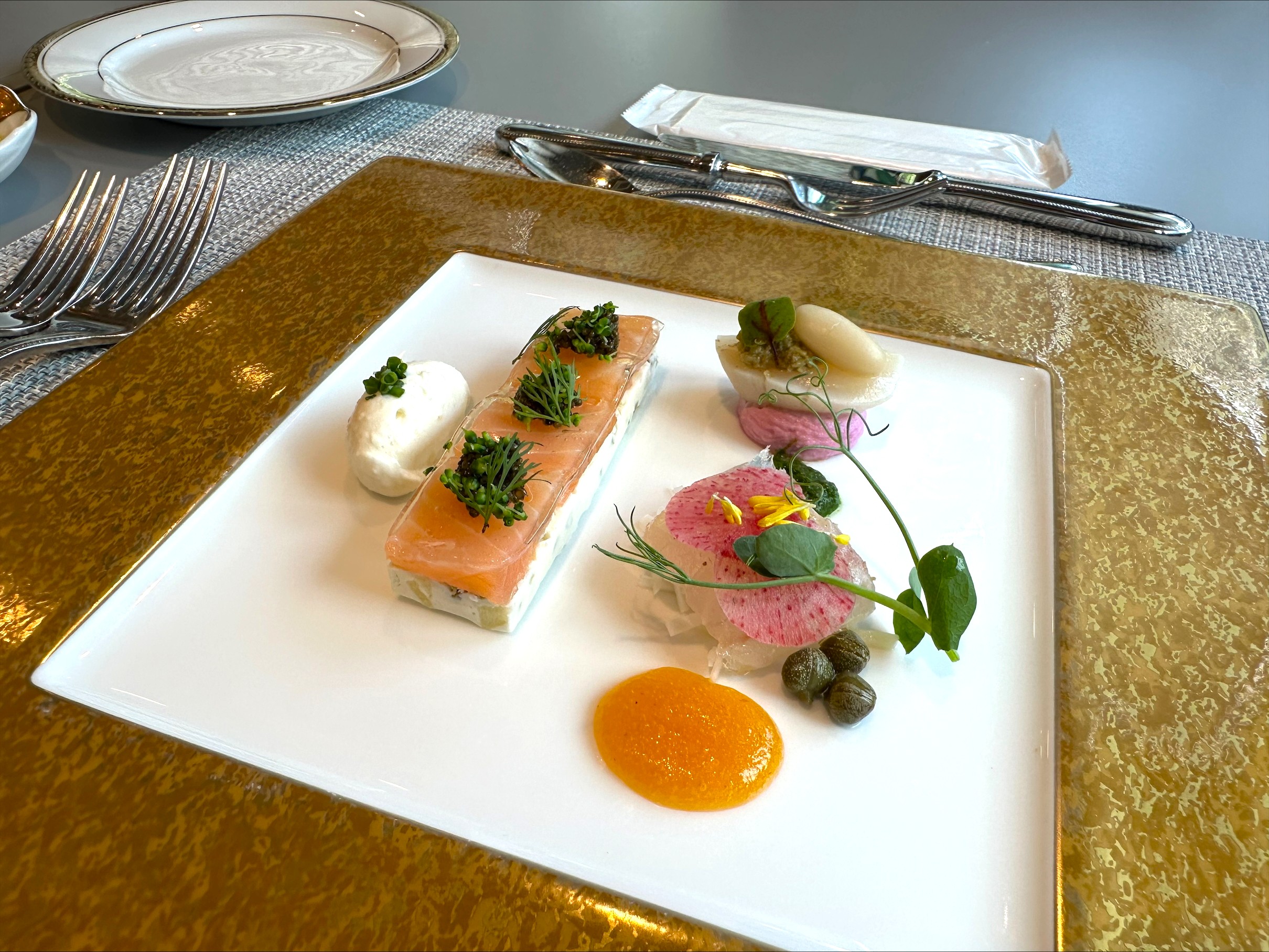 口の中に広がる燻製の香りとジャガイモのテリーヌの調和、また酸味のあるレフォールクリームとの