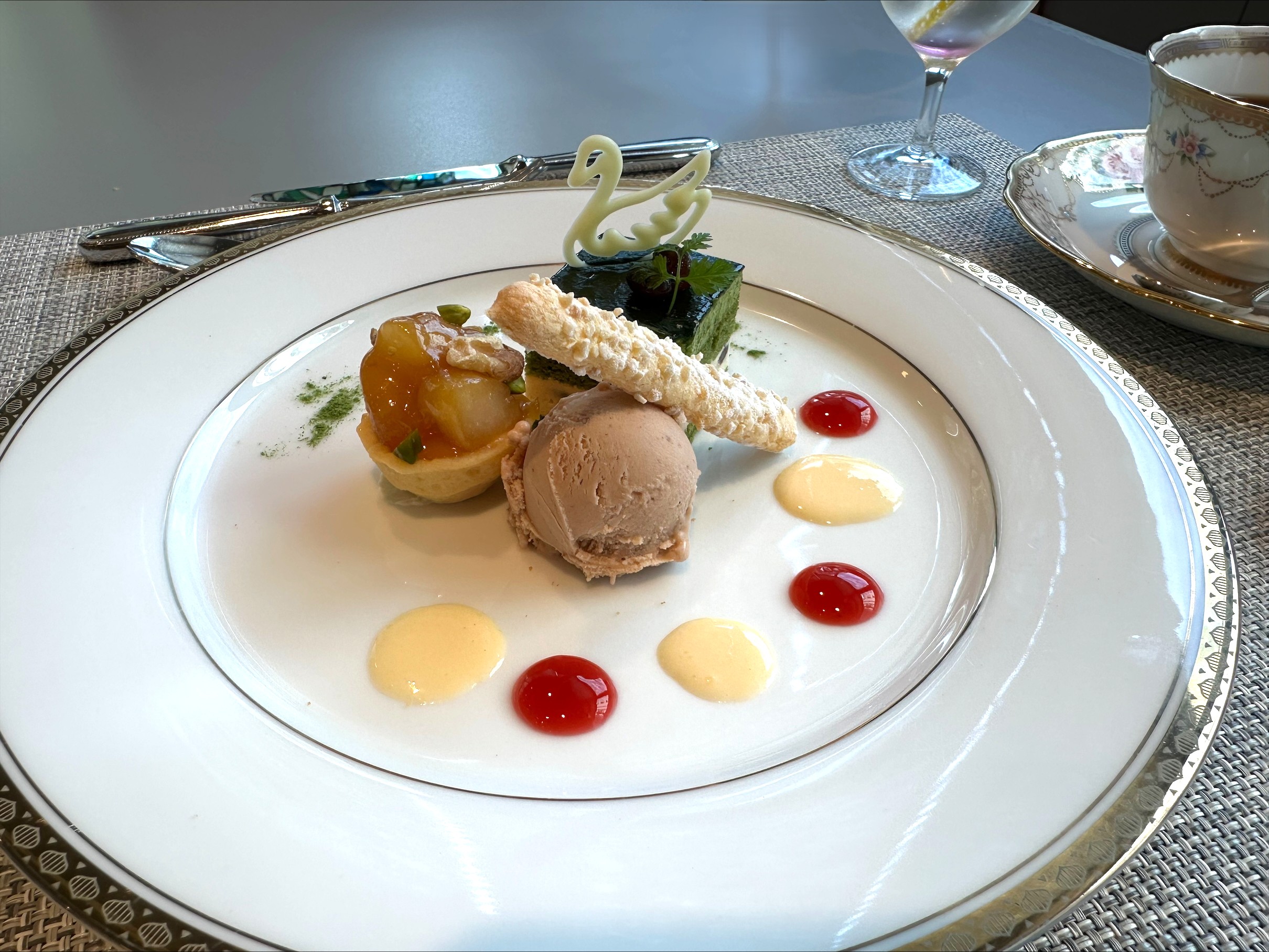 ・抹茶のガトーと洋梨のタルト、マロンのアイスクリーム添え