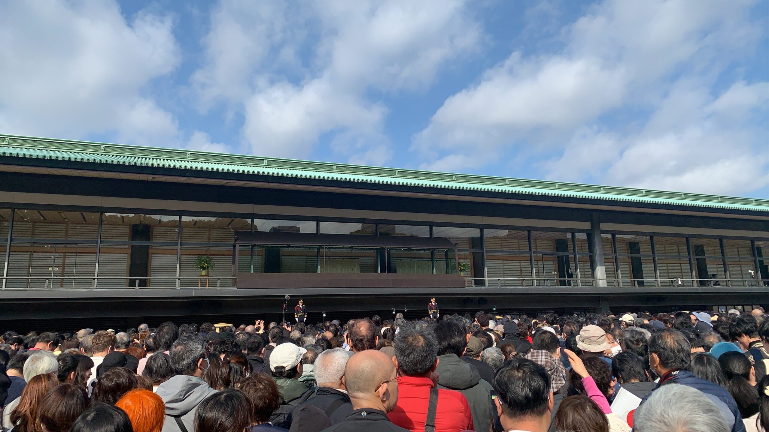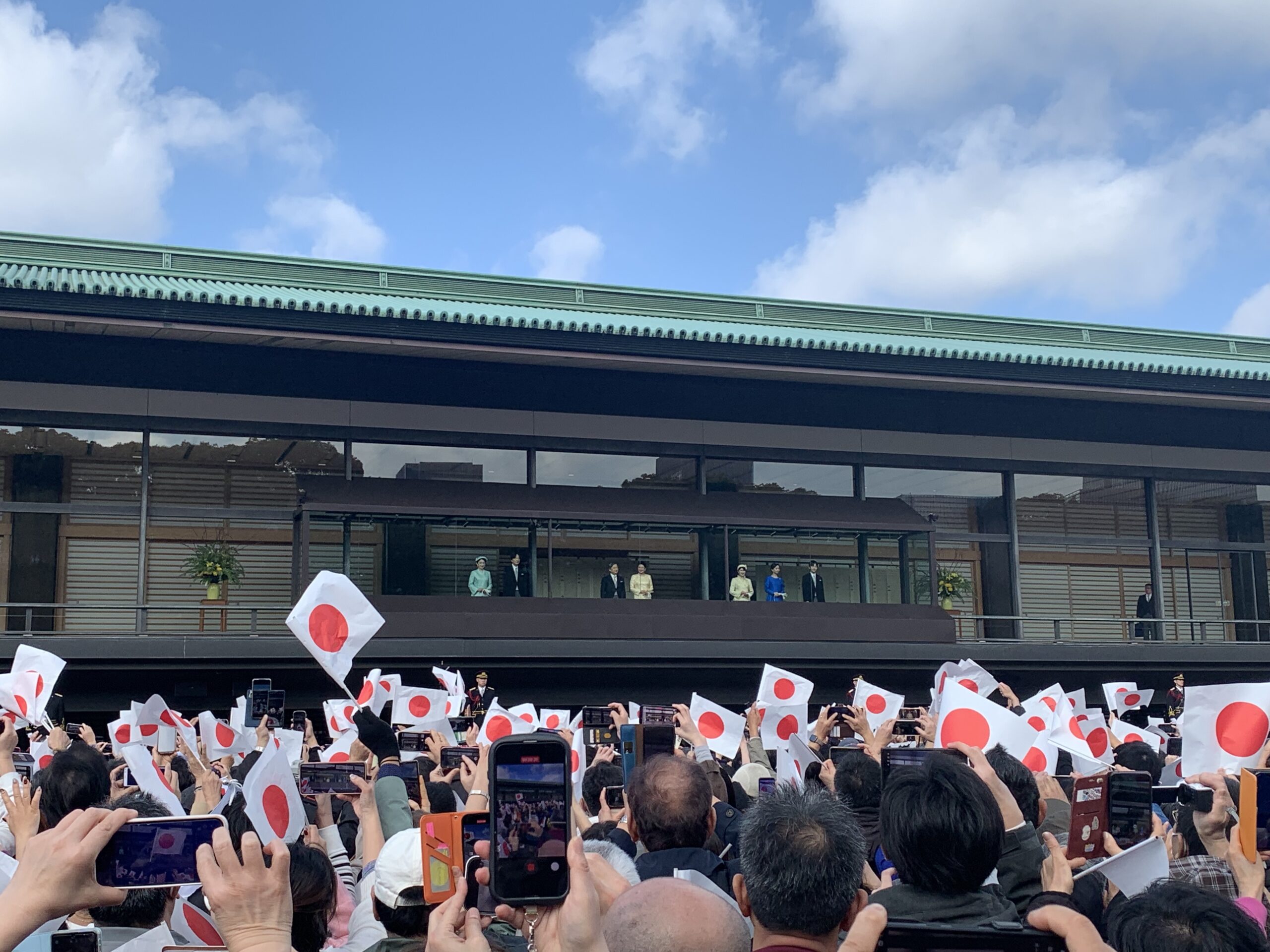 長和殿ベランダ前にて待つこと30分。ついに目の前に天皇皇后両陛下と敬宮愛子内親王殿下がお出ましになられました。