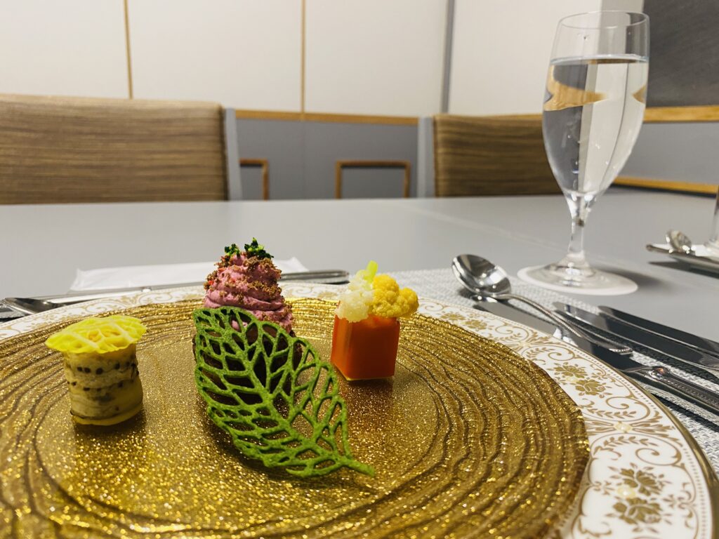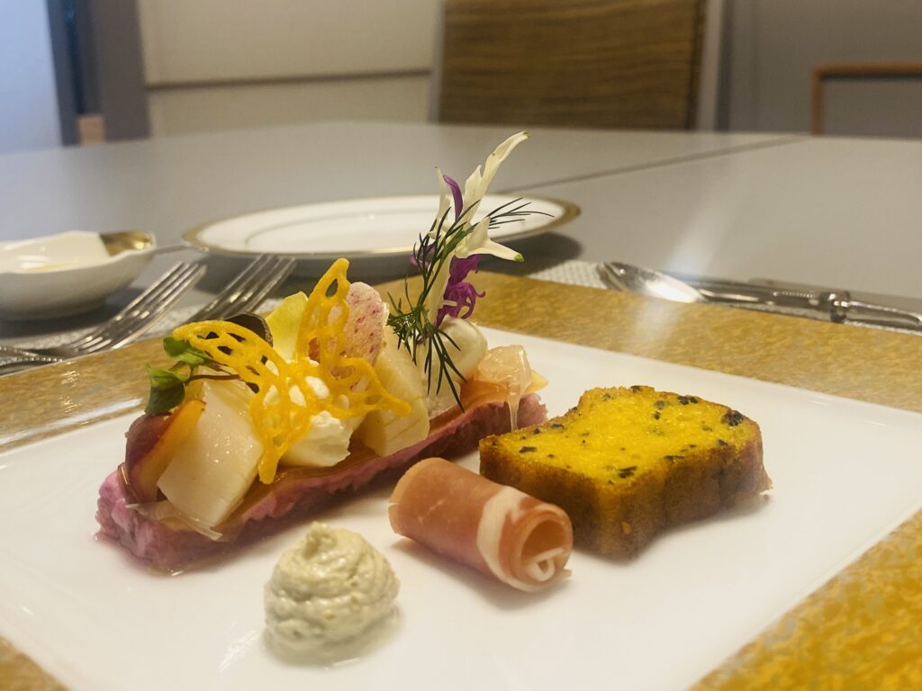 貝の甘みと紫芋クリームのコクが広がる、華やかな一皿です。